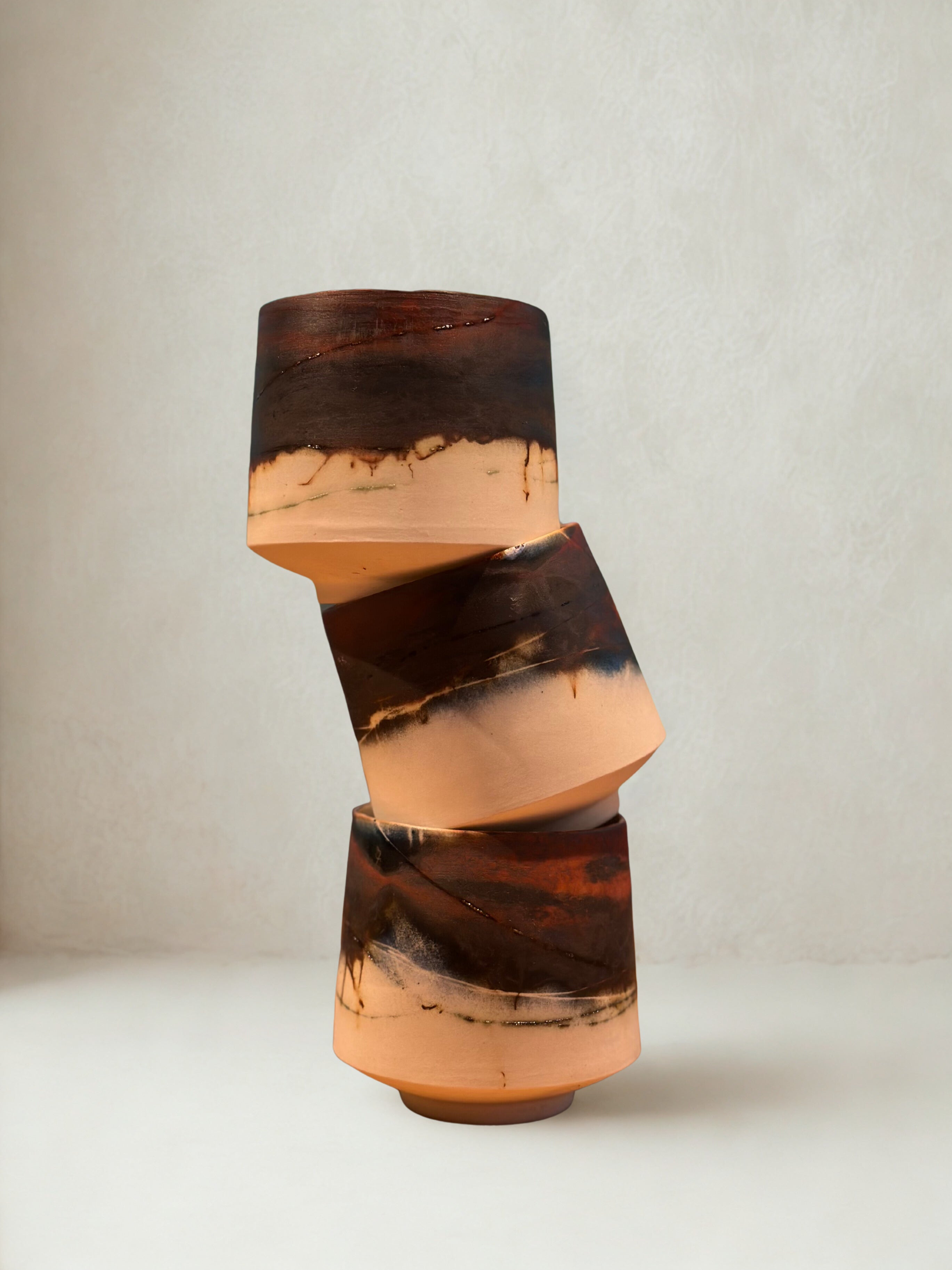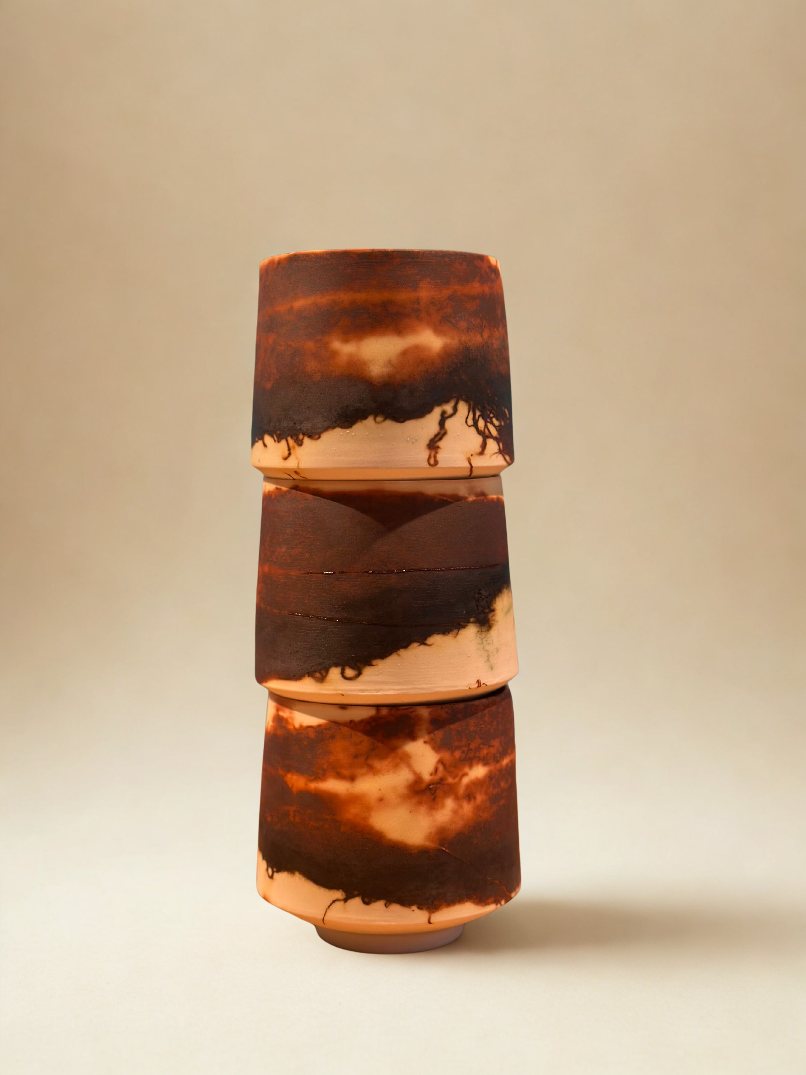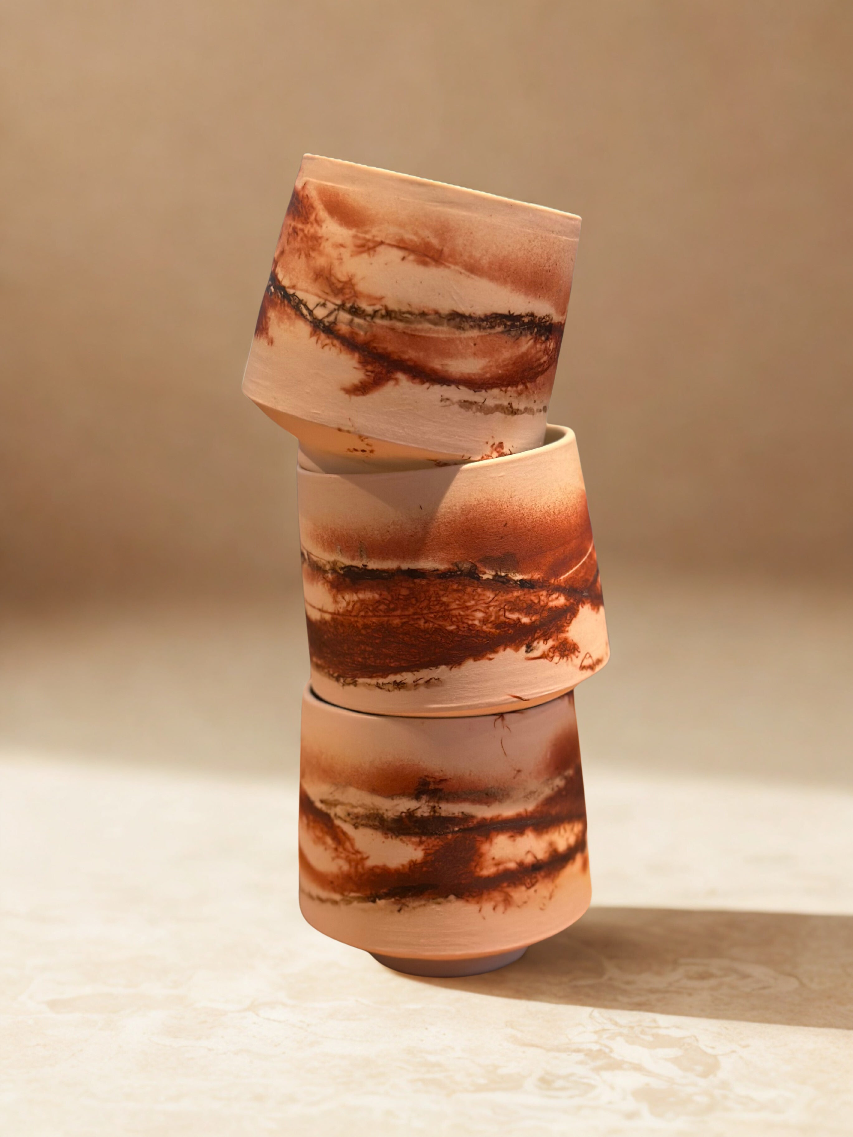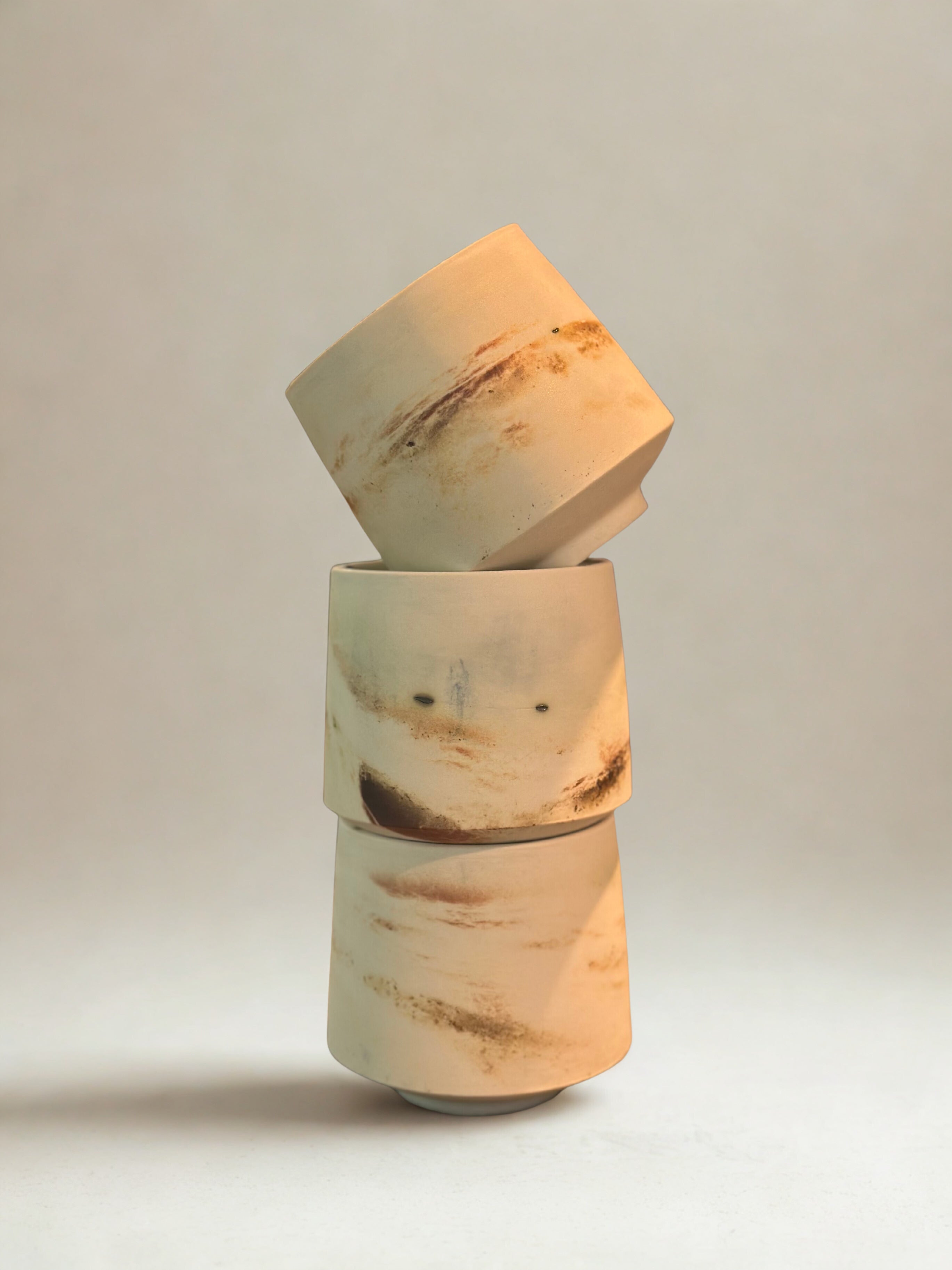 The interiors are glazed with a transparent finish—sometimes satin, glossy, or matte—to preserve functionality, while the exteriors are left to carry the marks of transformation. Every vessel holds a memory of its passage through the elements: fire’s intensity, air’s currents, and earth’s minerals all leaving their signatures.