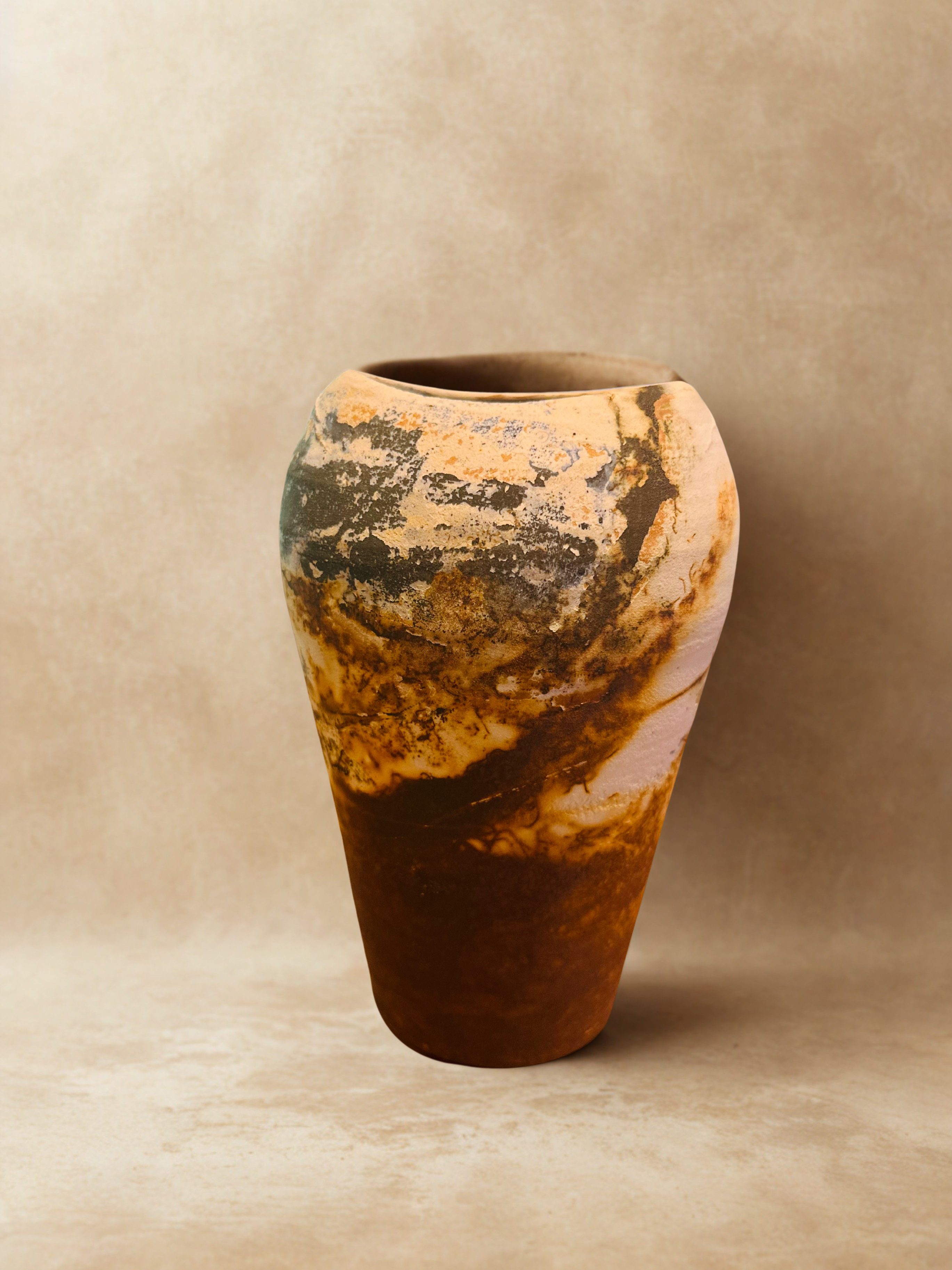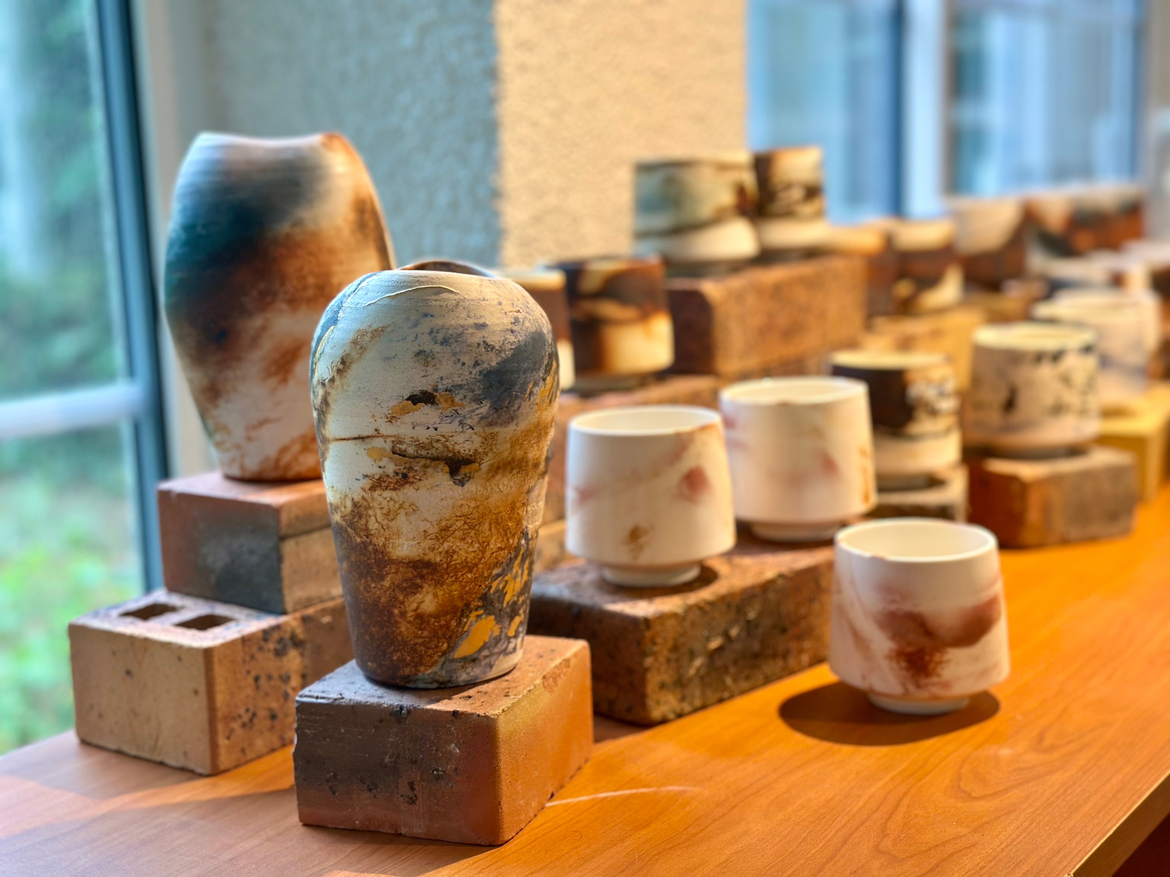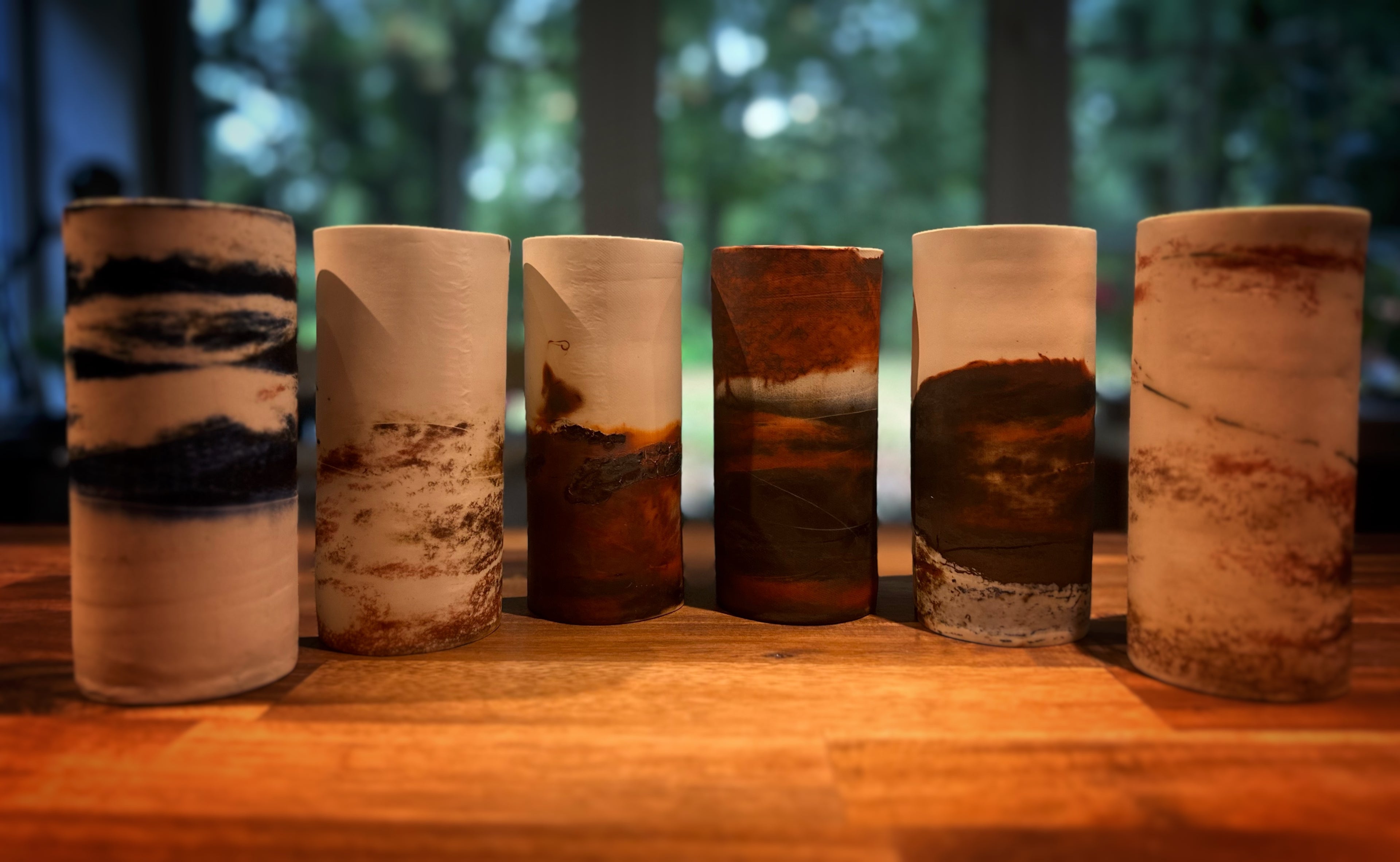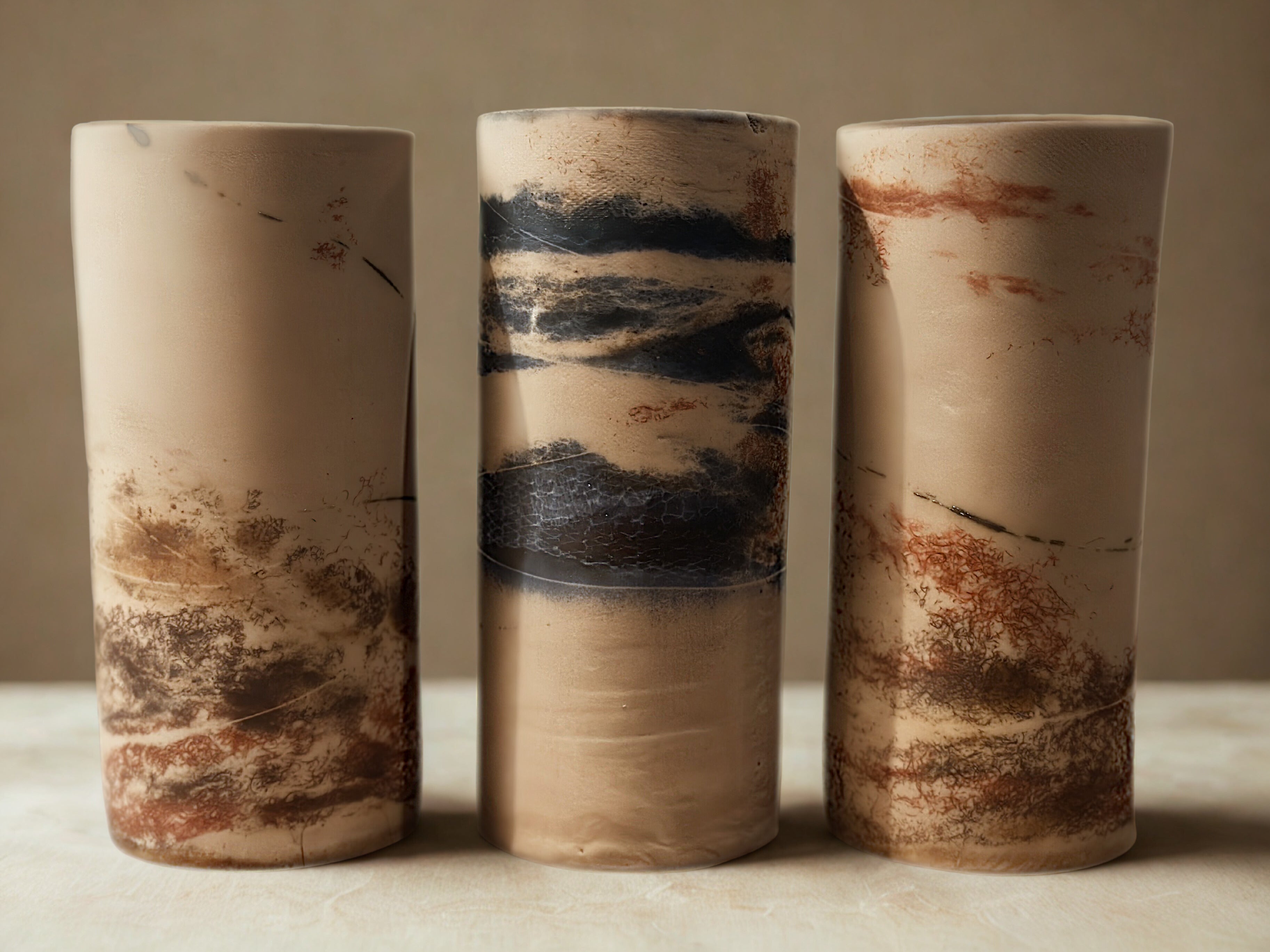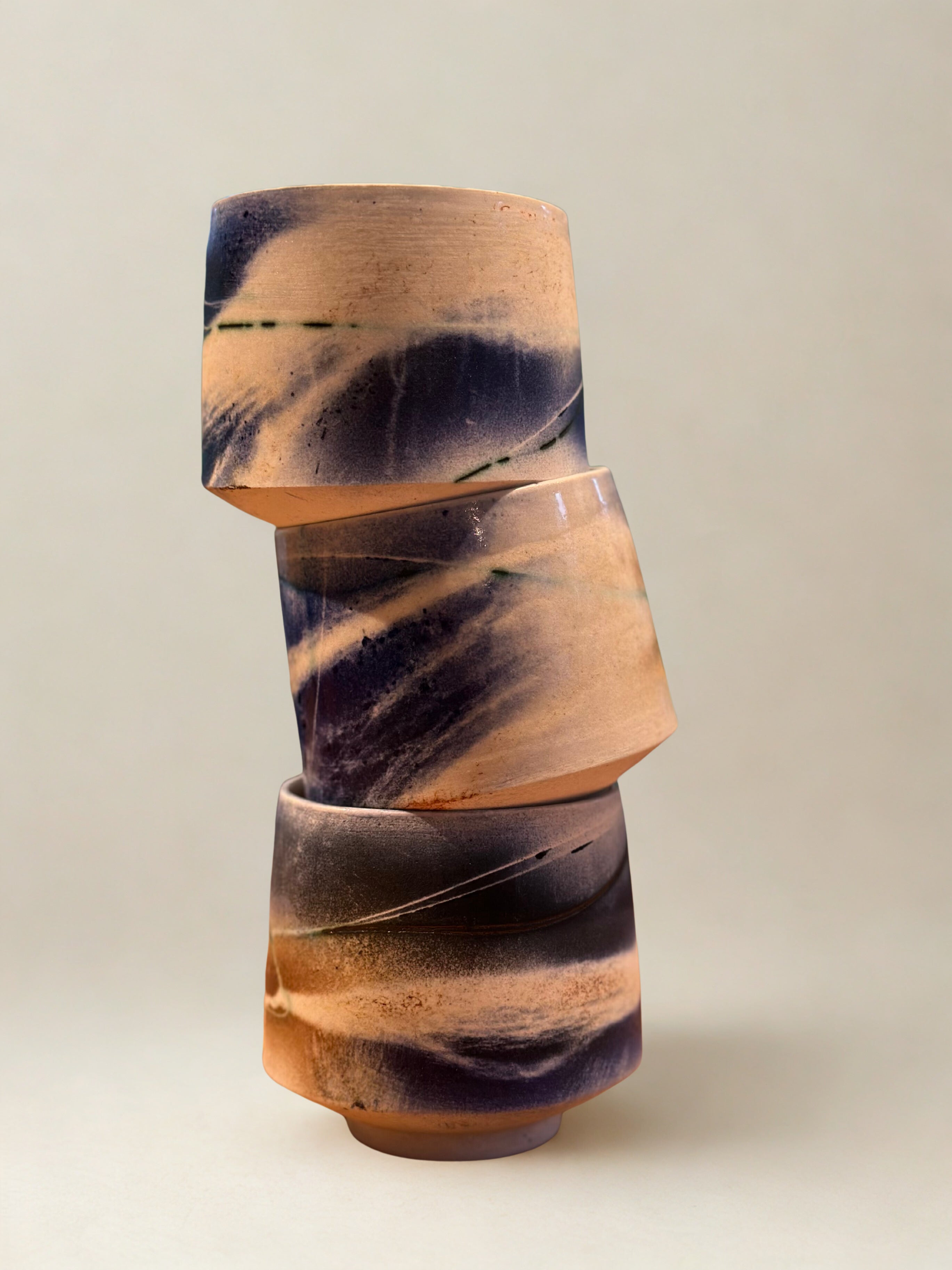 The interiors are glazed with a transparent finish—sometimes satin, glossy, or matte—to preserve functionality, while the exteriors are left to carry the marks of transformation. Every vessel holds a memory of its passage through the elements: fire’s intensity, air’s currents, and earth’s minerals all leaving their signatures.
