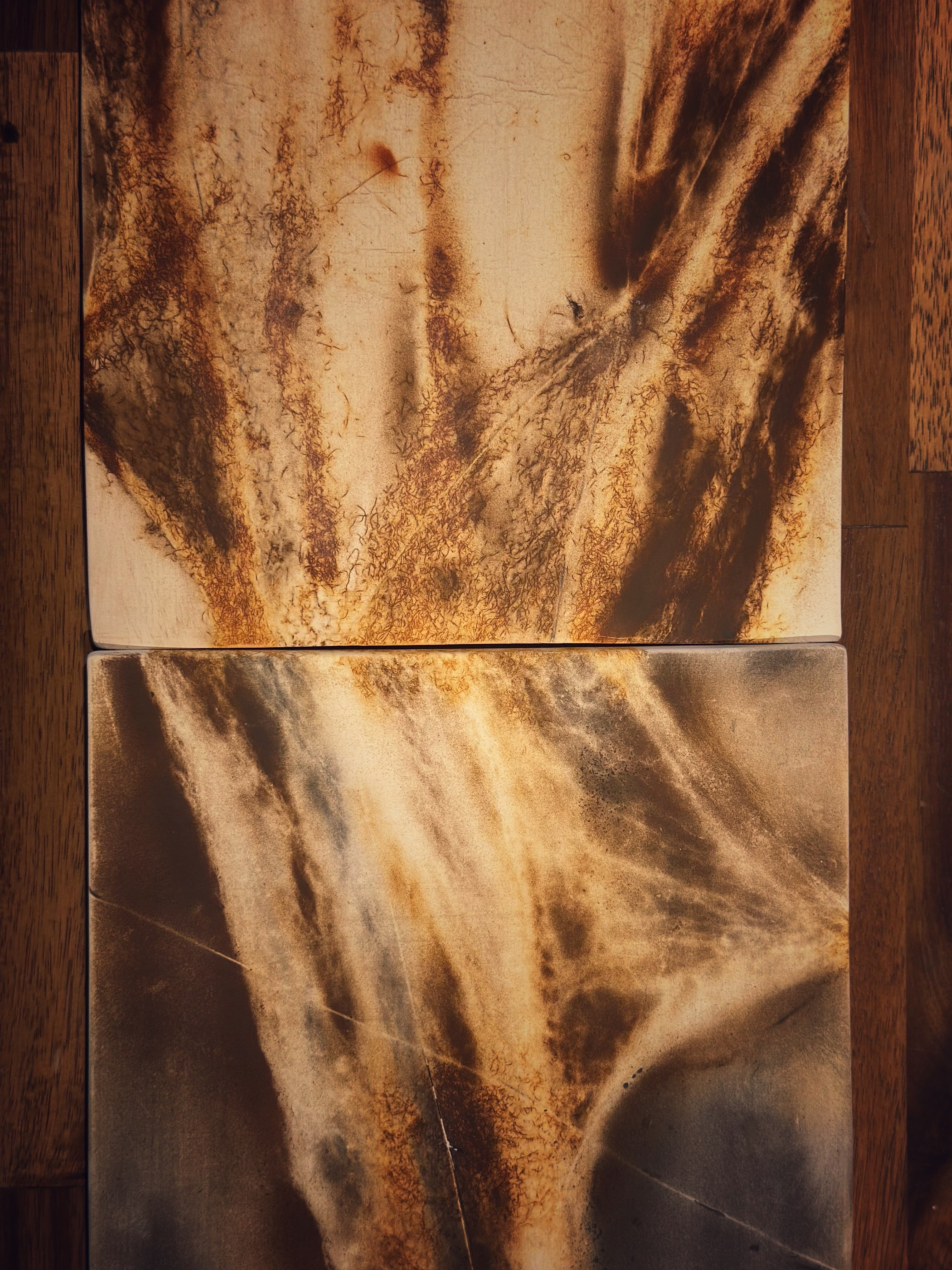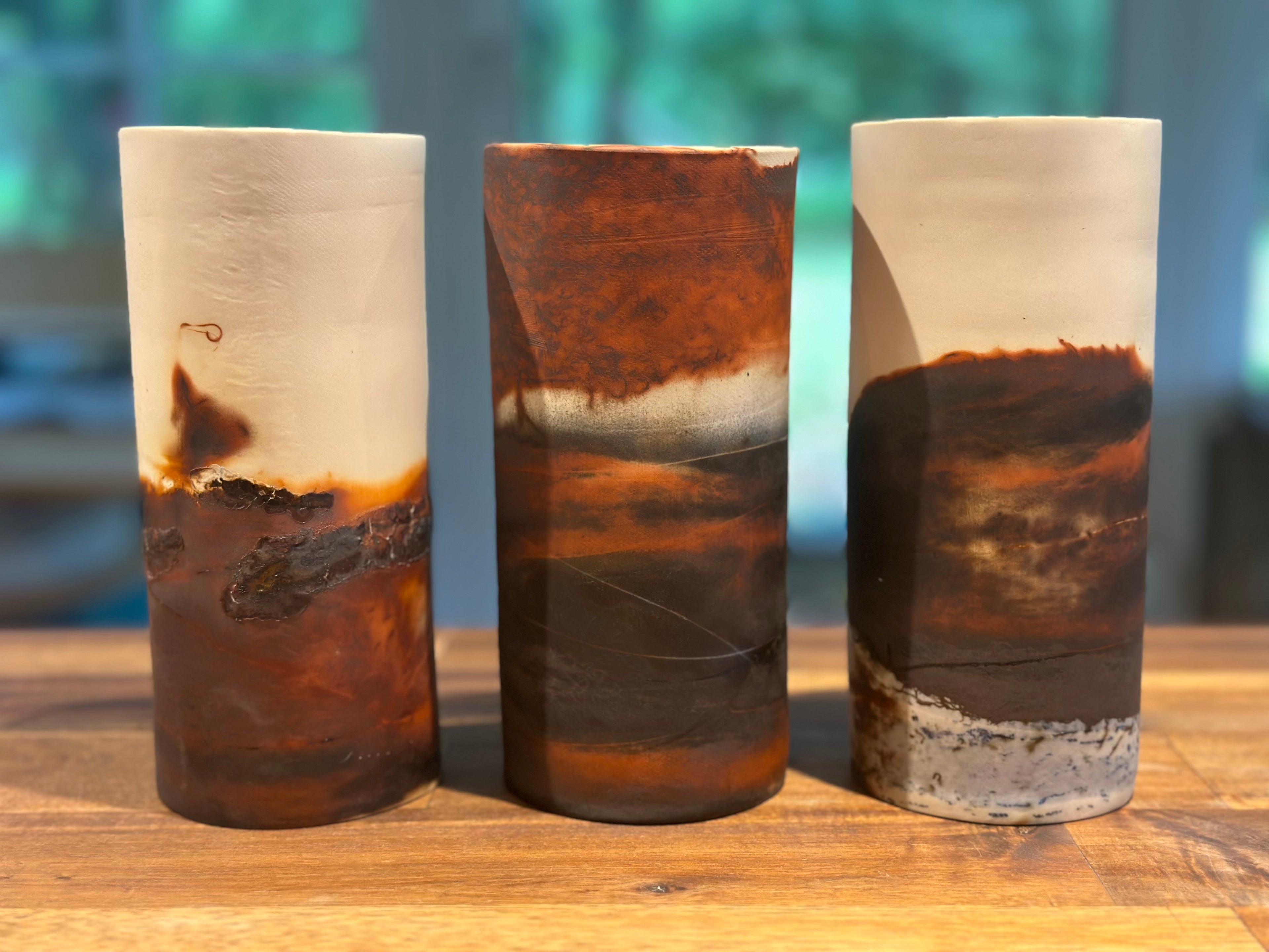 The process is one of surrender as much as control: I prepare each piece with intention, shaping and refining the porcelain form by throwing and hand-building techniques, then airbrush selected surfaces with oxides and layer the saggar with natural matter that will transform under heat. Once sealed inside, the work enters the kiln, where fire becomes both collaborator and storyteller. The results are never fully known until the kiln is opened.